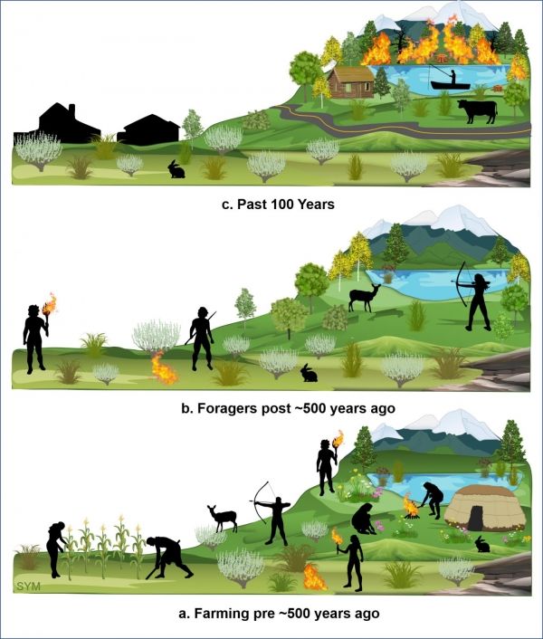 A schematic of what the authors think the landscape and human activity was like over the last 1,200 years in the Fish Lake Plateau region. A) 1,200 to 500 years ago, high density of people hunting, harvesting wild plants and cultivating crops. They controlled the fire regime with cultural burning that created a landscape dominated by the plants for sustenance rather than dense forest typical of the elevation. B) 500-100 years ago, farming activity ceased abrupt. Forgers and hunters still practiced cultural burning, although much less than farmers had previously. Trees began to slowly expand their range. C) Past 100 years, European settlers made cultural burning illegal, and the landscape became dominated by forests, setting up conditions for catastrophic wildfires. (Photo Credit: S. Yoshi Maezumi)