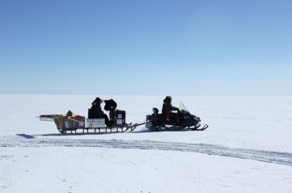 The antennas of the radar are situated at the rear end of the sleigh. They send impulses into the ice, which are reflected by different properties in the ice and return the impulse signals to the antennae. Data can be plotted as a radio-echogram, from which you can read out thickness of the ice, the rock under the ice and different layers of ice in the ice sheet. Radar measurements from flyovers work in much the same way as the sleigh radar. Each radar can be adapted to focus on different properties, such as the shift from ice to bedrock, ice layer, melt layer etc. (Photo Credit: Christian Panton)