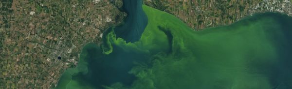 Most bodies of water contain microscopic, photosynthesizing organisms called cyanobacteria, which are harmless at normal levels. Individual cyanobacteria are tiny, visible only under a microscope. But certain conditions – lots of sunlight, stagnant water, and high amounts of nutrients like those in fertilizers – allow cyanobacteria populations to grow exponentially. The result is scummy green water that can be seen from space. These events, called harmful algal blooms, can lead to economic losses and poor water quality, and pose a health risk to humans and animals.