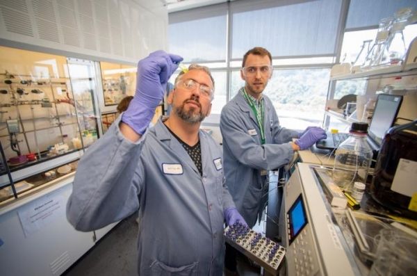 Image: Brett Helms, foreground, pictured at work in the Molecular Foundry in 2019. (Credit: Thor Swift/Berkeley Lab)
