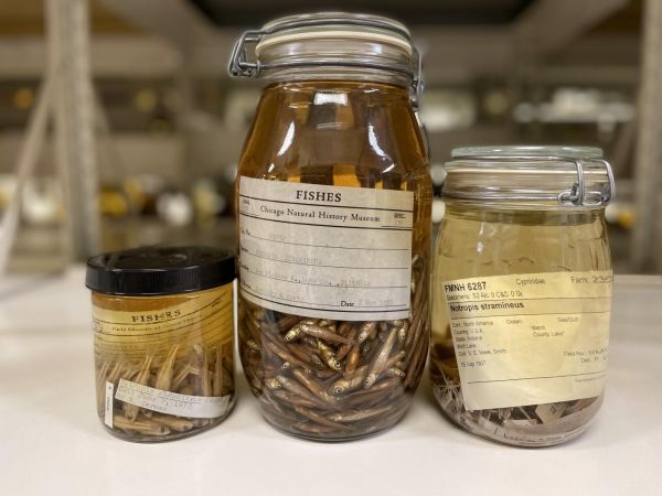 Image: Specimens of sand shiner fish in the Field Museum's collections collected in 1972, 1953, and 1907. (Credit: Kate Golembiewski, Field Museum)