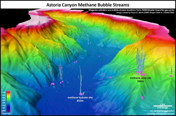 However, results of a recently published paper indicate that nearly 3,500 methane bubble streams, clustered into more than 1,300 methane emission sites, emanate from the seafloor from the Strait of Juan de Fuca in the north to the Mendocino Fracture Zone off northern California in the south, in an area known as the Cascadia Margin.