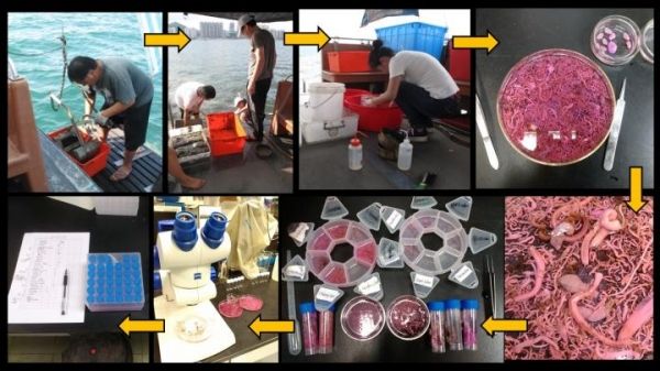 The photo at the bottom right-hand corner shows the benthic organisms collected in Hong Kong waters. (Photo Credit: CityU's State Key Laboratory of Marine Pollution)