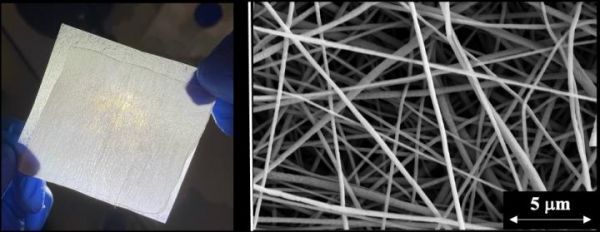 Image: Left: A nanofiber filter that captures 99.9% of coronavirus aerosols; Right: A highly magnified image of the polymer nanofibers. (Credit: Yun Shen)