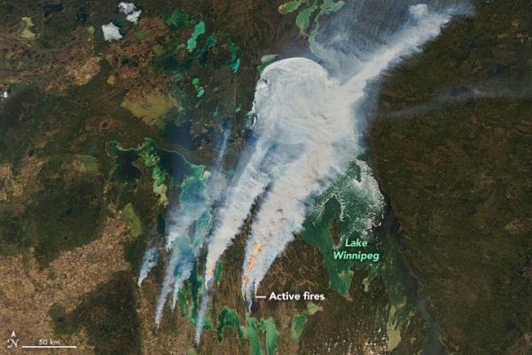 On May 18, 2021, the Moderate Resolution Imaging Spectroradiometer (MODIS) on NASA’s Aqua satellite acquired this natural-color image of smoke billowing from several intense wildfires west and southwest of Lake Winnipeg. Strong westerly winds drove the plumes across Hudson Bay and the Canadian interior as far as Quebec. Other fires (not shown) burned to the west in Saskatchewan and to the east in Ontario. Researchers examining NOAA GOES satellite images detected hints of pyrocumulus “fire cloud” formation south of Lake Winnipeg.