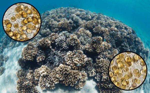 A community of Pocillopora corals on a reef in Palau with light micrograph insets of Cladocopium pacificum nov. (left) and Cladocopium latusorum sp. nov. (right), two dinoflagellate symbionts critical to these coral animals' health and growth. (Photo Credit: Coral Photo, Tom Bridge, James Cook University; Algae Photos, Kira Turnham, Penn State)