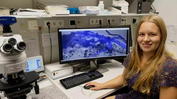 Image: Clarissa Karthäuser in the lab. On the screen you see a coloured and highly magnified particle. (Credit: Max Planck Institute for Marine Microbiology / C. Karthäuser)