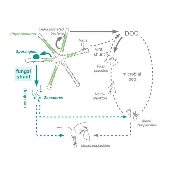 Fungus creates an underappreciated express lane for carbon, "shunting" as much as 20 percent of the carbon fixed by diatoms out of the microbial loop and into the fungal parasite. (Photo Credit: Klawonn et al. 2021, PNAS)