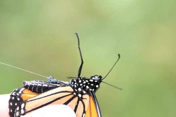 A monarch is fitted with a radio tracker. (Photo Credit: Alana Wilcox)