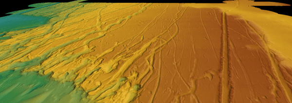 These 3D perspective views of the seafloor bathymetry from multibeam sonar offshore of South Carolina show numerous grooves carved by drifting icebergs. As iceberg keels plow into the seafloor, they dig deep grooves that push aside boulders and piles of sand and mud along their tracks. Sediment cores from nearby buried iceberg scours were used to determine when these icebergs travelled south along the coast. (Photo Credit: Jenna Hill, U.S. Geological Survey, Pacific Coastal & Marine Science Center)