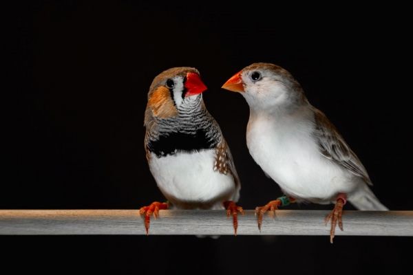 Adult male zebra finches (left) learn their songs and use them during courtship interactions with females (right). (Photo Credit: Raina Fan)