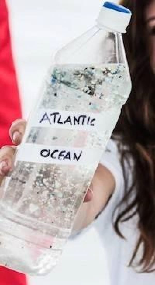 An assortment of microplastic fragments, filaments, and fibers from the North Atlantic Subtropical Gyre displayed in a disposable water bottle. (Photo Credit: Nicole Trenholm / Ocean Research Project)