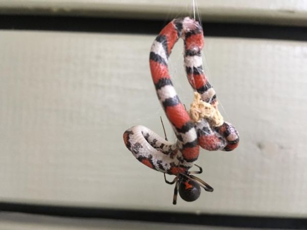 Image: Juvenile scarlet snake (Cemophora coccinea, Colubridae) entrapped on web of Latrodectus geometricus, observed in a private residence in Georgia, USA. (Credit: Daniel R. Crook)