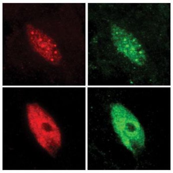 Image: Nuclei of plant cells are seen before and after the plant was exposed to shade. In the top images (before), the transcription factor PIF7 (red) is confined in speckles that contain the plant's light sensors (green). In the lower images (after), in the shaded plant, PIF7 is released, which is then free to bind to DNA and initiate gene activity. (Credit: Chan Yul Yoo, Meng Chen lab, UC Riverside)