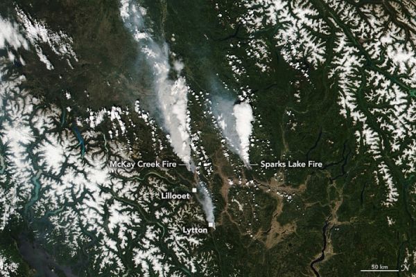 The Visible Infrared Imaging Radiometer Suite (VIIRS) on the NOAA-20 satellite acquired this image (above) around 2 p.m. local time (21:00 Universal Time) on June 30, 2021. By the morning of July 1, the McKay Creek fire (left) and the Sparks Lake fire (right) had burned an estimated 150 and 200 square kilometers (60 and 75 square miles), respectively. A smaller fire is visible just south of the town of Lytton.