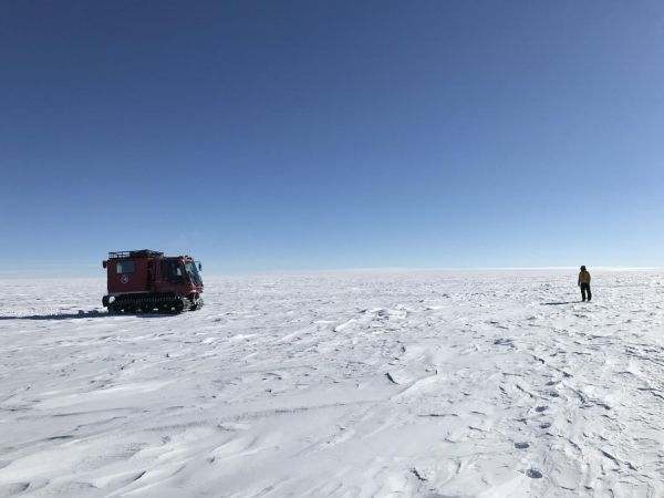 NASA researchers on the surface of the Antarctic Ice Sheet as part of the 88-South Traverse in 2019. The 470-mile expedition in one of the most barren landscapes on Earth provides the best means of assessment of the accuracy of data collected from space by the Ice Cloud and land Elevation Satellite-2 (ICESat-2). (Photo Credit: NASA's Goddard Space Flight Center/Dr. Kelly Brunt)