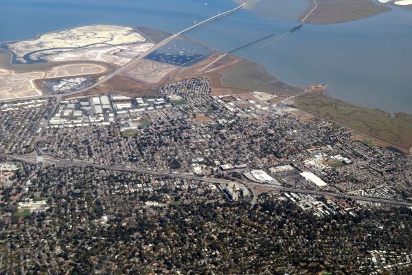 An aerial view of East Palo Alto, which borders San Francisco Bay. New research shows about half the households in East Palo Alto are at risk of financial instability from existing social factors or anticipated flooding through 2060. (Photo Credit: Wikimedia Commons)