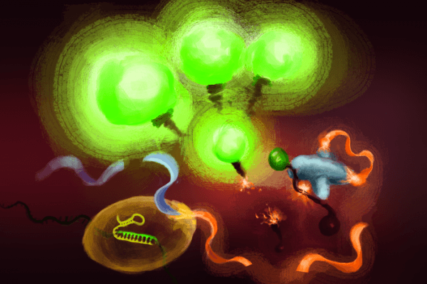 Image: The reactions involved in the FIND-IT assay to detect infection with the SARS-CoV-2 virus. When the Cas13 enzyme (bottom left) binds to its target RNA, it snips a molecule (orange and light blue ribbon) to release an activator (orange) that supercharges the Csm6 nuclease (right) to cleave and release fluorescent molecules that light up (green) and signal the presence of viral RNA. (Credit: Artwork courtesy of Margaret L. Liu, University of Chicago Pritzker School of Medicine)