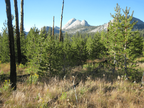 Image: In Yosemite’s Illilouette Creek basin, a stand of young Sierra lodgepole pine grow in a forest clearing that was created by wildfire 20 years prior. Mt. Starr King appears in the background. (Credit: UC Berkeley photo by Scott Stephens)