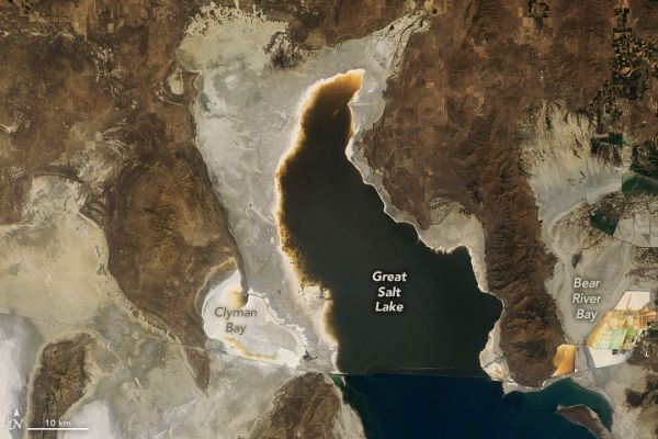 The Operational Land Imager (OLI) on Landsat 8 acquired images (above) of the north end of the Great Salt Lake on July 29, 2017, and July 24, 2021. Orange-brown areas along the edges of the lake indicate shallow water, while bright tan and white fringes suggest newly exposed portions of the lakebed. Note, too, the depletion of water in Clyman Bay and Bear River Bay. (Landsat also acquired images of the southern end of the lake during a similar dry spell in 2016.)