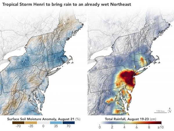 Henri did not reach the northeast U.S. coast at hurricane force, but the slow-moving storm still left a soggy mark on the region as it became a rare tropical cyclone to make landfall in New England. Months of rain fell in a few hours across New Jersey, New York, and several other states from August 21-23, landing on soils that were already soaked by an excessively wet summer.