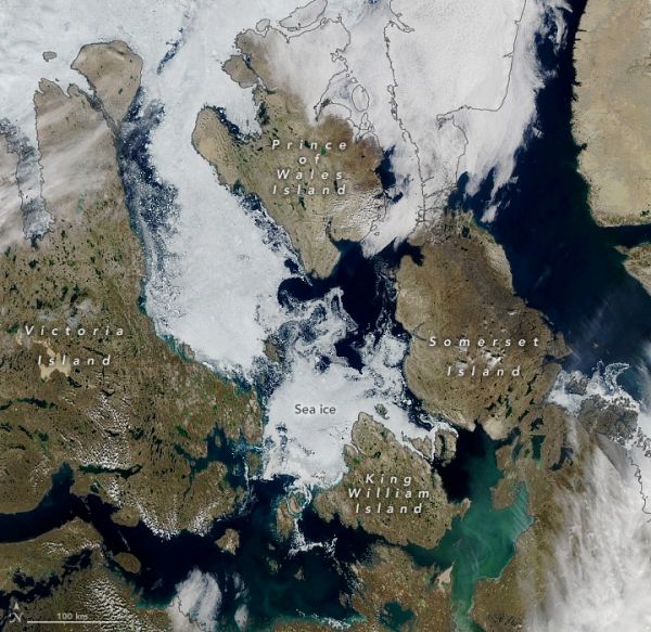 For centuries, explorers have tested the icy waters of the Arctic, looking for sea routes through the cluster of islands north of mainland Canada. Such a route, known as the Northwest Passage, can dramatically shorten the journey between the Pacific and Atlantic Oceans. The decline of sea ice in the Arctic Ocean has made this passage increasingly viable. But as this image shows, it’s still not always smooth sailing.