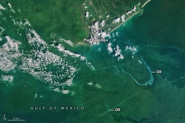 On September 3, 2021, the Operational Land Imager (OLI) on Landsat 8 acquired this natural-color image of apparent oil slicks off the southeastern Louisiana coast near Port Fourchon, a major hub of the oil and gas industry.