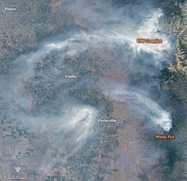 On September 15, 2021, the Operational Land Imager (OLI) on Landsat 8 acquired imagery of the KNP fire complex, the Windy fire, and the thick smoke plumes both have released. The image below includes infrared data with the thermal signature of some fire fronts beneath the plumes. NASA’s Terra satellite acquired broad-area images of the same region from September 10-16.