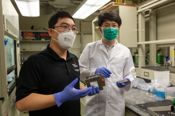 Image: UC chemical engineering assistant professor Jingjie Wu, left and doctoral student Tianyu Zhang are experimenting with different catalysts to convert carbon dioxide to storable fuel to address climate change. (Photo: Andrew Higley/UC Creative + Brand)