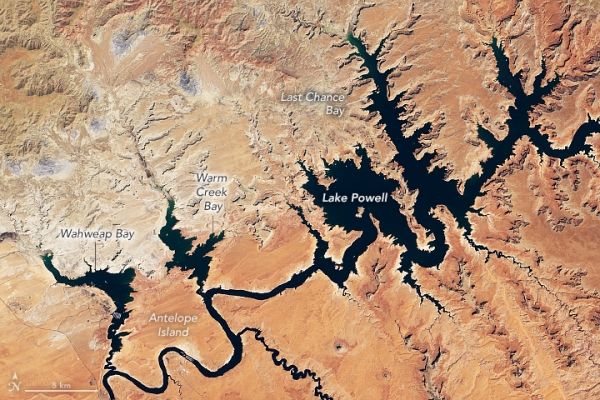 Straddling the border of southeastern Utah and northeastern Arizona, Lake Powell is the second largest reservoir by capacity in the United States. In July 2021, water levels on the lake fell to the lowest point since 1969 and have continued dropping. As of September 20, 2021, the water elevation at Glen Canyon Dam was 3,546.93 feet, more than 153 feet below “full pool” (elevation 3,700 feet). The lake held just 30 percent of its capacity. To compensate, federal managers started releasing water from upstream reservoirs to help keep Lake Powell from dropping below a threshold that threatens hydropower equipment at the dam.