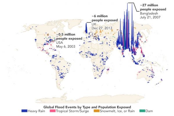 Reviewing 20 years of NASA satellite data, researchers mapped 913 large flood events across 169 countries and compared them with global population data to better understand the impact on people. The team found that from 2000–2015 between 58 and 86 million more people could be found living in floodplains around the world. More than 255 million people were affected at least once by major floods in that period. The increase in exposure includes new human developments and migration, but also the reclassification of some lands in the wake of large flood events and sea level rise. The types of flood events and number of people affected are represented in the map above.
