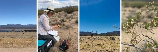 L-R: Stateline Solar Park, Dr Alona Armstrong taking a soil surface measurement, Dr Alona Armstrong and Dr Rebecca R. Hernandez walking a soil surface transect, Creosote bush (Larrea tridentata), a dominant evergreen shrub found in the Ivanpah Valley, where Stateline PV Solar Park is located. (Photo Credit: Dr Rebecca R. Hernandez, University of California Davis)