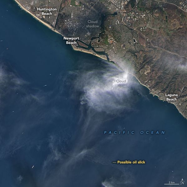 At least two satellites caught a glimpse of oil in the ocean off the coast of Southern California on October 2-3, 2021. The first image above is a natural-color view acquired at 11:22 a.m. Pacific Daylight Time (18:22 Universal Time) on October 3 by the Operational Land Imager (OLI) on Landsat 8. Amid clouds and haze, as well as white streaks from large cargo ships and boat wakes, hints of oil are faintly visible. Half a day earlier, the European Space Agency’s Sentinel-1B satellite acquired a radar image at 6:49 p.m. PDT on October 2 (01:49 UTC on October 3). The slick stands out better in this view.