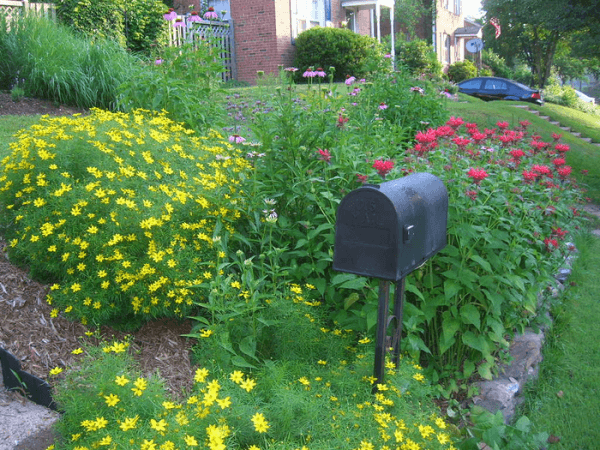 Image: A USDA Forest Service scientist was part of a team that explored the value of the biggest chunk of green space found in cities - residential yards - as wildlife habitat. Photo shows coreopsis, bee balm, and purple coneflower near a residential mailbox. (Credit: Photo by David Mizejewski, National Wildlife Federation)