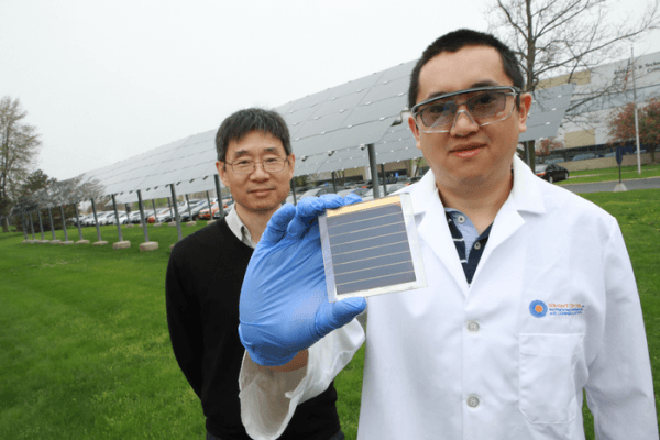 Image: Dr. Zhaoning Song holds a perovskite solar cell minimodule he developed with Dr. Yanfa Yan. The higher-efficiency, lower-cost solar cell technology could revolutionize energy generation around the globe. (Credit: Daniel Miller, The University of Toledo)