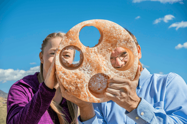Image: Sandia National Laboratories researchers Melissa Mills, left, and Kristopher Kuhlman peer through a salt sample from their Waste Isolation Pilot Plant experimental site. (Credit: Photo by Randy Montoya/Sandia National Laboratories)