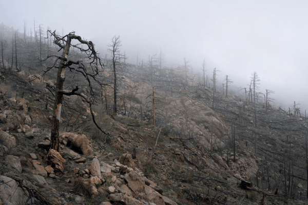 Image: Wildfire-damaged trees in Sunshine Canyon outside Boulder, Colorado (Credit: Intricate Explorer / Unsplash)
