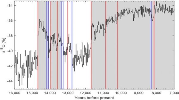 Image: North Greenland Ice Core Project record showing the end of the last ice age. Vertical lines mark the detected abrupt transitions (red for warming, blue for cooling). Gray shading represents warm periods. (CREDIT: Witold Bagniewski)