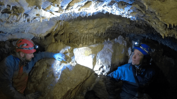 Dr Bethany Fox conducting research with Matthias Magiera in a cave in New Zealand. (Photo Credit: Dr Sebastian Breitenbach)