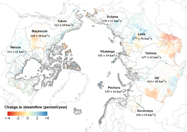 “We recreated the river discharge information all over the pan-Arctic region. Previous studies didn’t do this,” Feng says. “They only used some gauge data and only for certain rivers, not all of them, to calculate how much water is pouring into the Arctic Ocean.”