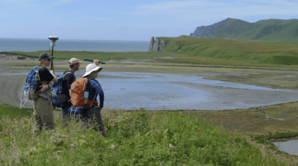 Image: Fralin Life Scientes Institutes' Tina Dura (right) conducts research with colleagues Richard Briggs (United States Geological Survey) and Simon Engelhart (Durham University) on an island off the coast of Alaska. Photo courtesy of Rich Koehler for Virginia Tech. (Credit: Virginia Tech)
