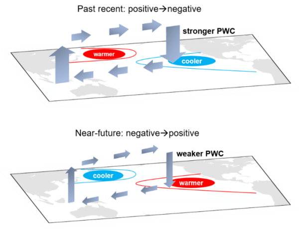 Image: Schematic illustrates the impact of Interdecadal Pacific Oscillation (IPO) phase transition on the strength of Pacific Walker circulation (PWC) in past recent and near-future. (Credit: MIngna Wu)