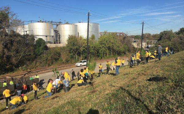 Image: Houston Wilderness and corporate volunteers plant “super trees” at an industrial site along Peavy Drive, near Buffalo Bayou. Members of Rice University’s Department of Statistics helped produce a new study that offers strategies to other cities interested in planting trees to mitigate environmental concerns. (Courtesy of Houston Wilderness)