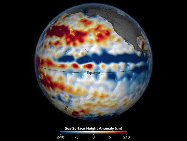 Part of the El Niño-Southern Oscillation cycle, La Niña appears when energized easterly trade winds intensify the upwelling of cooler water from the depths of the eastern tropical Pacific, causing a large-scale cooling of the eastern and central Pacific ocean surface near the Equator. These stronger than usual trade winds also push the warm equatorial surface waters westward toward Asia and Australia. This dramatic cooling of the ocean’s surface layers then affects the atmosphere by modifying the moisture content across the Pacific. This La Niña coupling of the atmosphere and ocean alters global atmospheric circulation and can cause shifts in the path of mid-latitude jet streams in ways that intensify rainfall in some regions and bring drought to others.