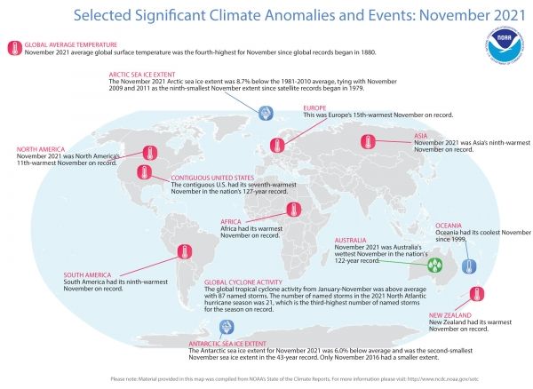 The average global land and ocean surface temperature for November 2021 was 1.64 degrees F (0.91 of a degree C) above the 20th-century average of 55.2 degrees F (12.9 degrees C). This was the fourth-warmest November on record — behind 2015 (warmest), 2020 and 2019. The world’s 10-warmest Novembers have all occurred since 2004.