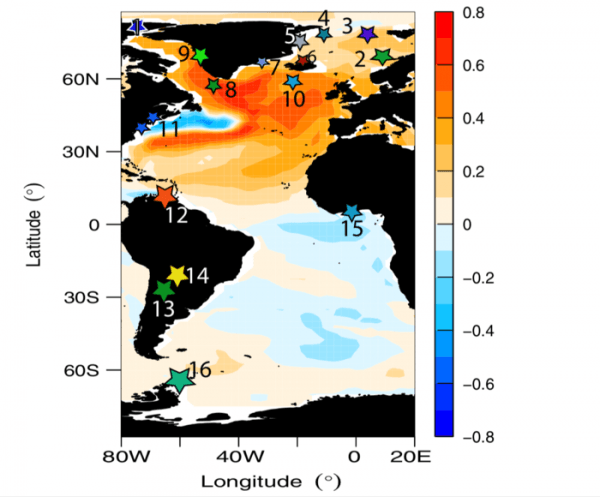 Multimodel mean correlation map between the low-frequency AMOC at 26°N and SST (12). Stars numbered 1 to 15 denote location of sites. (Photo Credit: Lapointe et. al., https://doi.org/10.1126/sciadv.abi8230)