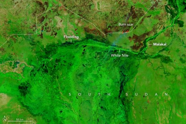 The images above show flooding in South Sudan’s Jonglei, Unity, and Upper Nile states on December 6, 2021 (right) compared to more typical conditions in December 2019 (left). These false-color images, acquired with the Moderate Resolution Imaging Spectroradiometer (MODIS) on NASA’s Aqua satellite, use a combination of infrared and visible light (bands 7-2-1) to make it easier to see the boundary between water and land. Water appears navy blue and black; saturated soil is light blue; clouds are white or cyan; and vegetation is bright green. In some areas, thick mats of floating vegetation made flooded areas appear green. In both years, multiple fires burned through grassland and savanna areas around the White Nile; they were likely set to maintain pastureland.
