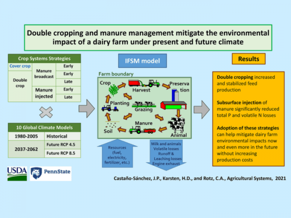 That’s the conclusion of a team of researchers, led by Penn State agroecologists, whose new study evaluated whole-farm production and the environmental and economic impacts of adopting these practices on a representative dairy farm in central Pennsylvania under recent historical and projected mid-century climate.