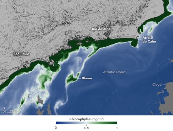 Beachgoers in the Brazilian state of Rio de Janeiro contended in late 2021 with unwelcome ocean-dwelling visitors. Starting in November, countless microscopic phytoplankton amassed along the coast, coloring the clear, blue waters a dark, reddish-brown. The bloom—known as a red tide or harmful algal bloom (HAB) event—was unusually widespread and long-lived.