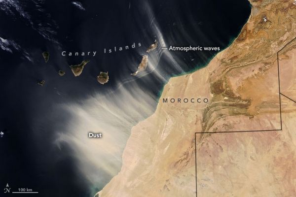 In mid-January 2022, dust from northwest Africa washed over the Canary Islands, causing skies to turn orange, visibility to drop, and air quality to decline. Such events, known to islanders as “la calima,” generally happen around this time of year as strong seasonal winds carry sand and dust away from the Sahara.